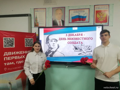 В рамках Дня воинской славы 1 декабря в 5 – 11 классах проводились уроки памяти, посвящённые Дню Неизвестного Солдата. Цель этих уроков — воспитать у школьников уважение к защитникам Родины и чувство гордости за народ, отстоявший свободу и независимость в годы Великой Отечественной войны. День Неизвестного Солдата — отмечаемая ежегодно 3 декабря. Она посвящена памяти советских и российских воинов, погибших в боях, чьи имена остались неизвестными. На Могиле Неизвестного Солдата в Москве высечены слова: «Имя твоё неизвестно, подвиг твой бессмертен». Победа в Великой Отечественной войне далась нашему народу дорогой ценой. В истории этой войны множество примеров мужества, стойкости и массового героизма. Эти качества стали неофициальным символом Дня Неизвестного Солдата. Ребята посмотрели тематический видеофильм и презентации. Для тех, чьи близкие погибли на фронтах Великой Отечественной войны, для тех, кто так и не узнал, где похоронены их братья, отцы, деды, Неизвестный Солдат всегда будет родным человеком, отдавшим жизнь за будущее своих потомков и своей Родины