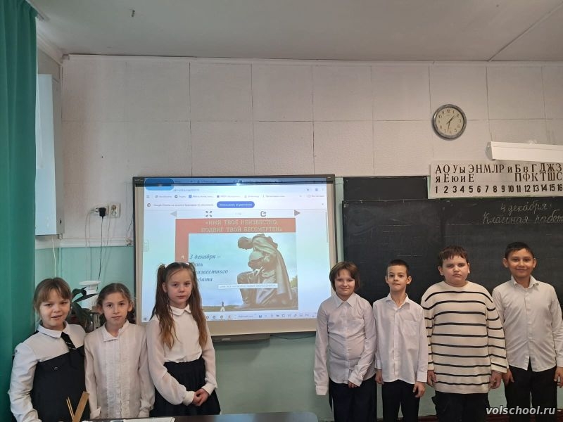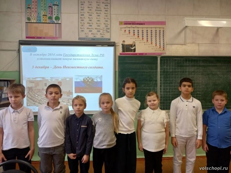 4 декабря классные руководители провели для учеников 1–4 классов урок, посвящённый Дню Неизвестного Солдата. Этот памятный день, отмечаемый 3 декабря, посвящён советским и российским воинам, погибшим в боях, чьи имена так и остались неизвестными. Дети с большим интересом посмотрели подготовленные презентации