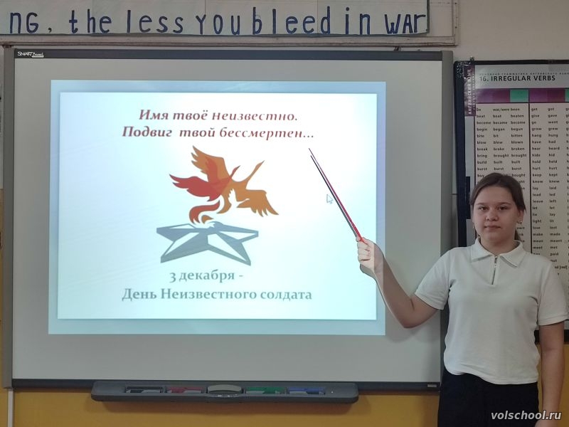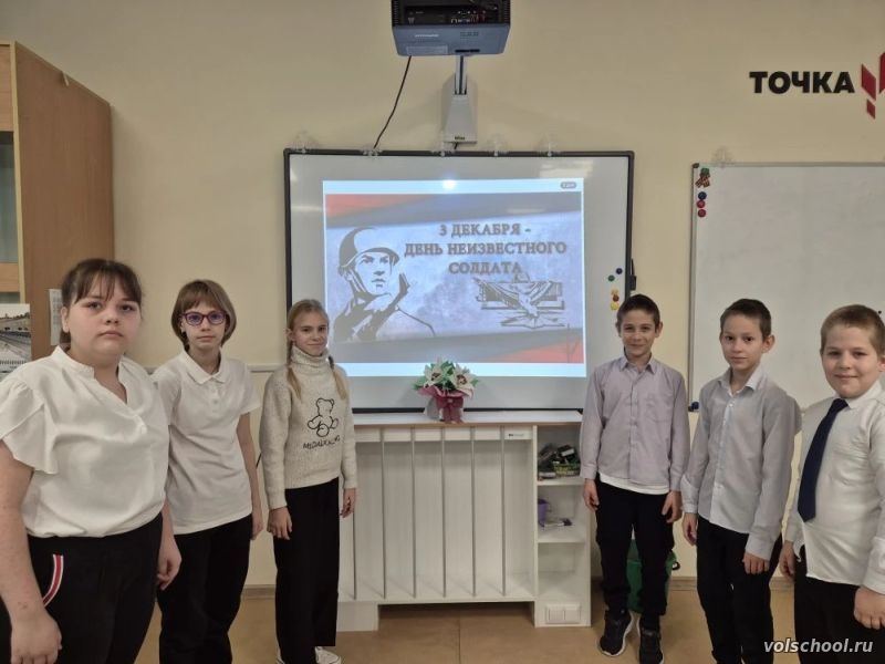 В рамках Дня воинской славы 1 декабря в 5 – 11 классах проводились уроки памяти, посвящённые Дню Неизвестного Солдата. Цель этих уроков — воспитать у школьников уважение к защитникам Родины и чувство гордости за народ, отстоявший свободу и независимость в годы Великой Отечественной войны. День Неизвестного Солдата — отмечаемая ежегодно 3 декабря. Она посвящена памяти советских и российских воинов, погибших в боях, чьи имена остались неизвестными. На Могиле Неизвестного Солдата в Москве высечены слова: «Имя твоё неизвестно, подвиг твой бессмертен». Победа в Великой Отечественной войне далась нашему народу дорогой ценой. В истории этой войны множество примеров мужества, стойкости и массового героизма. Эти качества стали неофициальным символом Дня Неизвестного Солдата. Ребята посмотрели тематический видеофильм и презентации. Для тех, чьи близкие погибли на фронтах Великой Отечественной войны, для тех, кто так и не узнал, где похоронены их братья, отцы, деды, Неизвестный Солдат всегда будет родным человеком, отдавшим жизнь за будущее своих потомков и своей Родины