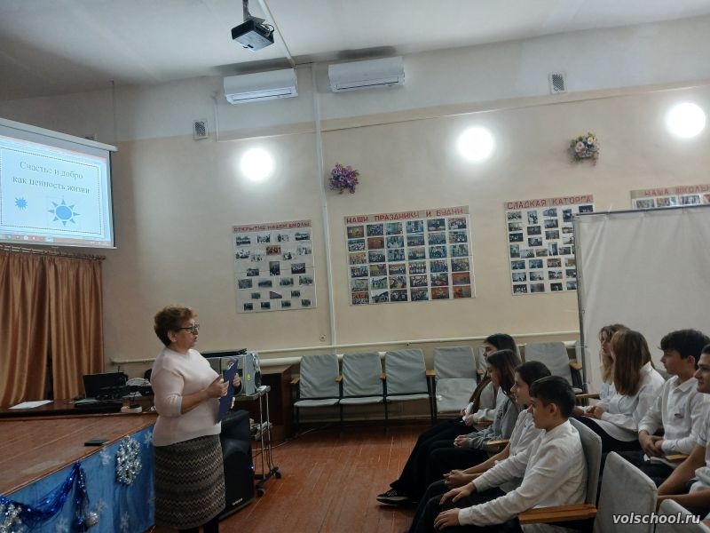 15 декабря 2025 года в актовом зале школы социальный педагог провела беседу с восьмиклассниками на тему «Счастье и доброта как ценности жизни». Цель встречи — расширить понимание школьниками понятий «счастье» и «доброта», показать их значимость в повседневной жизни, помочь осознать жизненные ценности и сформировать к ним ответственное отношение. Во время разговора ученики размышляли о счастье и доброте. После просмотра короткометражного фильма «Что такое счастье?» они оживлённо обсуждали, что приносит человеку радость. В итоге пришли к выводу: счастье — это субъективное понятие, связанное с семьёй, друзьями, увлечениями или другими важными аспектами жизни. Однако истинное счастье заключается в умении делиться им с окружающими. Важно, чтобы цепочка доброты не прерывалась, ведь счастье и добро неразрывно связаны