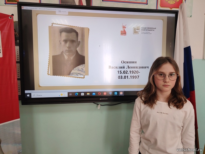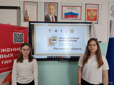 Активисты Движения Первых нашей школы Понятовская Екатерина и Левашова Варвара приняли участие во Всероссийской молодёжной акции "Наши семейные книги памяти". Учащиеся рассказали о своих прадедушках ветеранах Великой Отечественной войны, об их подвигах совершенных во время войны, заслуженных государственных наградах. Данная акция проводится при поддержке Центрального музея Великой Отечественной войны, общероссийского общественно-государственного движения детей и молодёжи "Движение первых", общественной палаты Российской Федерации с целью изучения школьниками и студентами страниц истории своей семьи