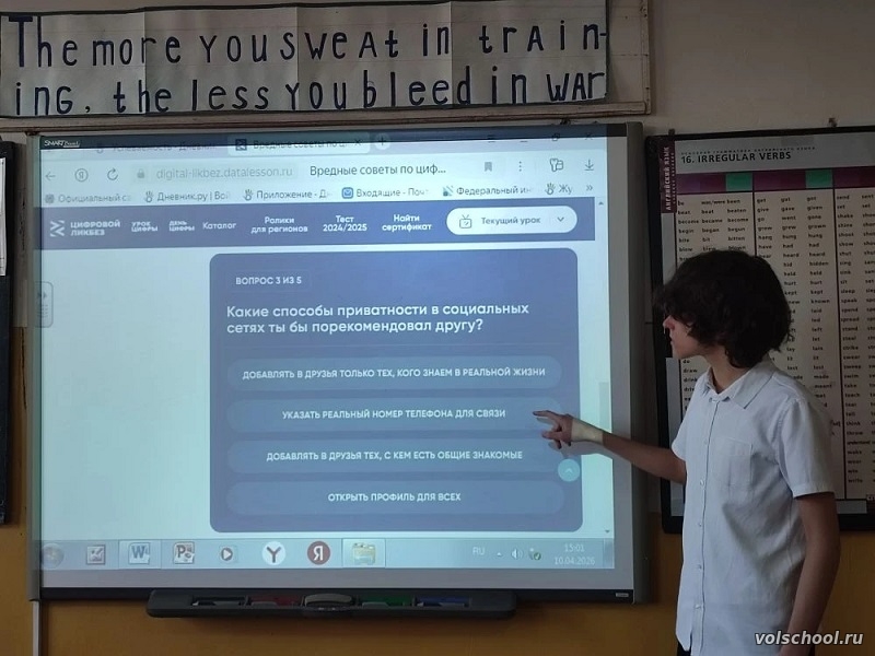 10 апреля 2026 на занятии по курсу внеурочной деятельности «Медиаграмотность» учащиеся 9 класса приняли участие в новом уроке «Цифрового ликбеза» от «Лаборатории Касперского» «Вредные советы по цифровой безопасности». Данный урок создан при поддержке экспертов команды Лаборатории Касперского. Далеко не все советы по цифровой безопасности в интернете могут полезными. Герой видеоролика морская черепашка Паша смог в этом убедиться. Однажды он подписался на канал с «полезными киберсоветами», но, к сожалению, их писал мошенник. Учащиеся познакомились с рекомендациями «Как защитить себя в цифровом мире?». В конце занятия учащиеся смогли оценить свои знания в области цифровой грамотности и открыть для себя интересные факты о мире технологий, а также получить сертификат