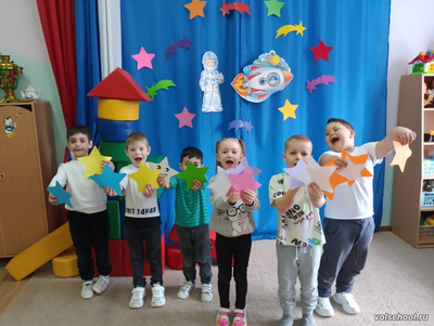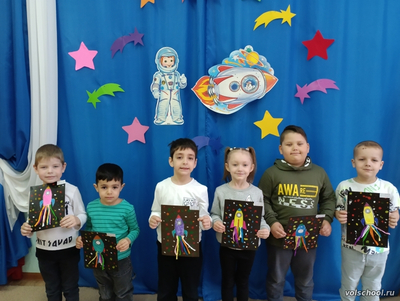 В преддверии Дня Космонавтики у дошколят прошло тематическое занятие «Удивительный мир космоса». Дети с большим интересом слушали рассказы о первом человеке, отправившемся покорять космическое пространство — Юрии Гагарине, о собаках Белке и Стрелке, которым удалось до человека побывать в космосе, узнали много интересного об учёных, стоявших у истоков развития космонавтики, о планетах Солнечной системы, о космических полётах. С большим удовольствием ребята изготовили ракеты из бумаги. Очень запоминающимся было посещение виртуального полета по солнечной системе и космические опыты «Кратеры на Луне», «Телескоп», «Млечный путь». А затем, построив ракету, всей группой дошкольники отправились покорять космическое пространство. Пройдя по шлюзу, вышли в открытый космос и собрали звезды, встретились с марсианами, поиграли с лунатиками, пересчитали кольца Сатурна. Подкрепившись в космическом кафе астероидами (вафлями), метеоритами (сладкими палочками), лунными камнями (печеньками) и звездным нектаром, путешественники вернулись на землю. У детей осталось море позитивных эмоций, появилось желание быть похожими на сильных духом и мужественных космонавтов