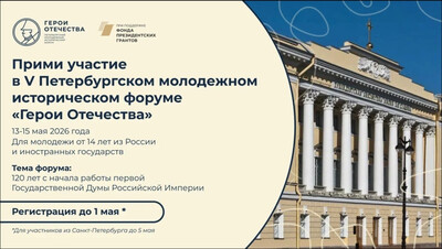 В период с 13 по 15 мая года в городе Санкт-Петербурге пройдет V Петербургский молодежный исторический форум «Герои Отечества» по инициативе команды школьников и студентов при поддержке Министерства просвещения Российской Федерации, Федерального агентства по делам молодёжи, Российского исторического общества, «Движение Первых», депутатов Государственной Думы и сенаторов Российской Федерации.